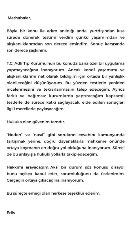 Ünlülere yönelik düzenlenen yasaklı madde soruşturması kapsamında gözaltına alınan ve test örnekleri veren Şarkıcı Edis Görgülü, test sonucunun pozitif çıkması